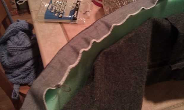 6. colocar al tejido interior de forro polar gris oscuro en la parte superior de su puerta. Intente colocar su costura bastante cerca de su puntada decorativa.