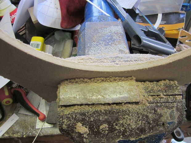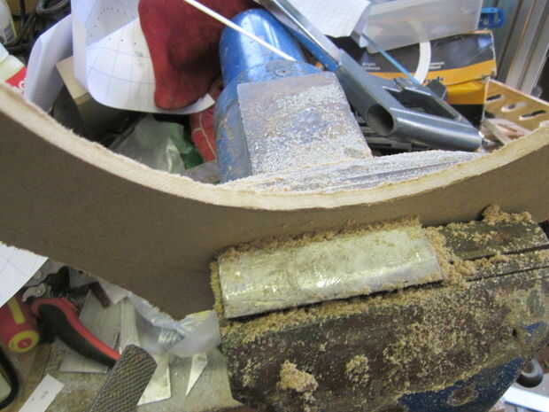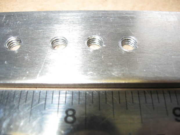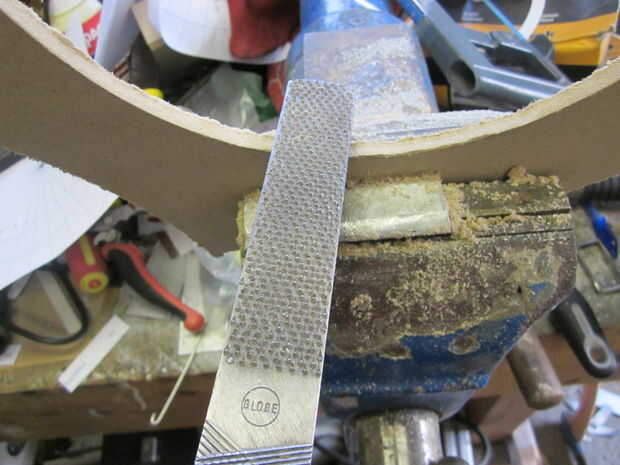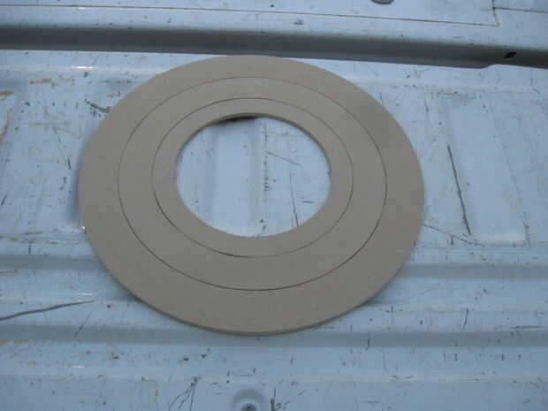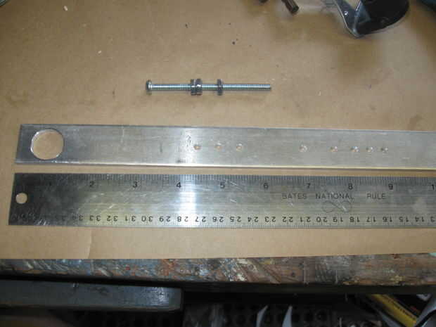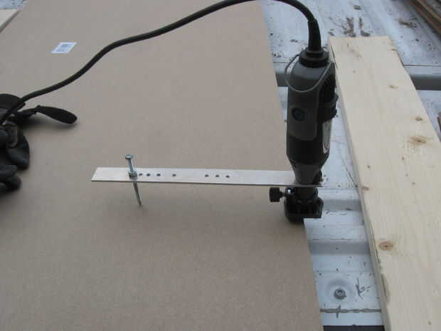 Me encargo había construido una plantilla de corte del círculo de Dremel para cortes burdos y mano de acabado de los bordes interiores. La herramienta es solo un pedazo de listón de aluminio con agujeros perforados en él.