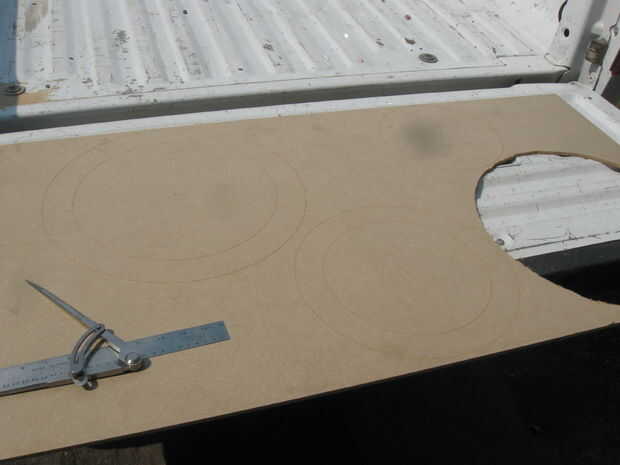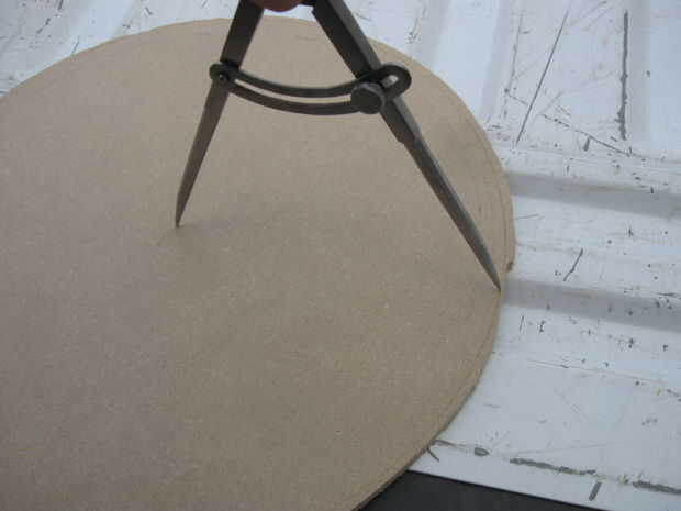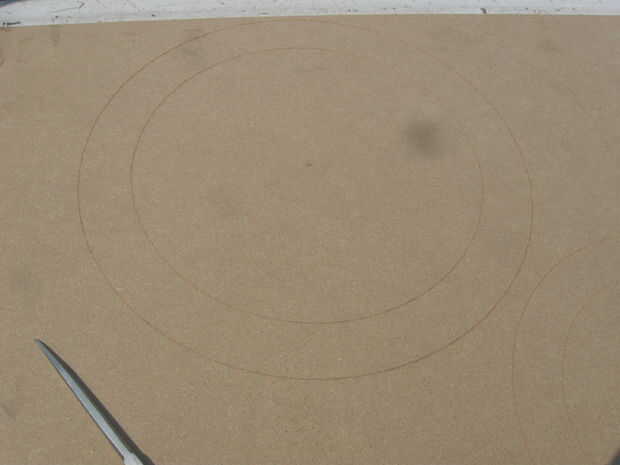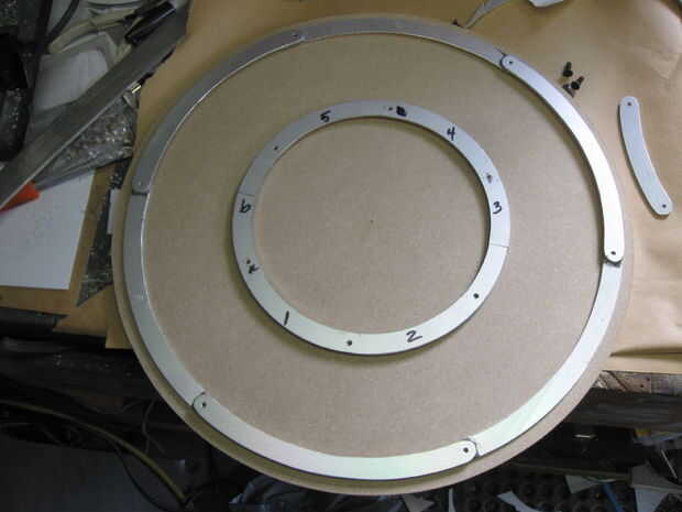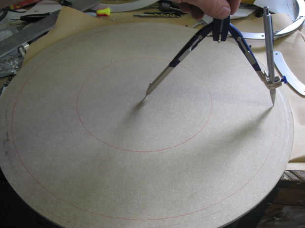 Yo de la mano en forma las piezas mediante un divisor para primer sorteo de los círculos, luego se corta con un Dermel con una broca de espiral. los círculos interiores eran mano presentó entonces arena mientras que los círculos exteriores fueron enarenados en una lijadora orbital de mano y mano lijadas.