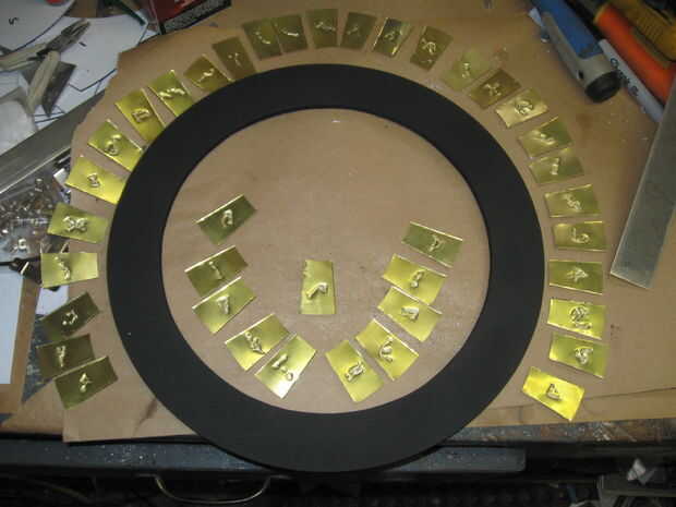 Usé un programa de dibujo para conseguir mi 39 segmentos en un círculo de 12 pulgadas de diámetro. He creado una plantilla y pegué a mi hoja de cobre amarillo del corte según sea necesario.