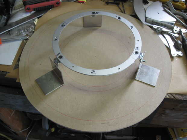 El anillo de apoyo interno fue sujetado con tornillos 8 3/32 a 3, 2 pulgadas aluminio escuadras que se pega a la pieza posterior en un círculo de 8 pulgadas.