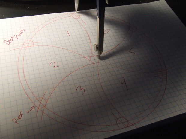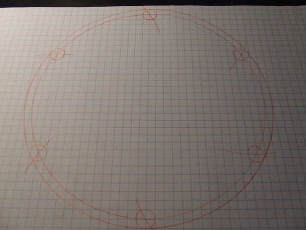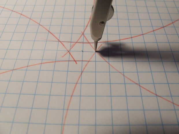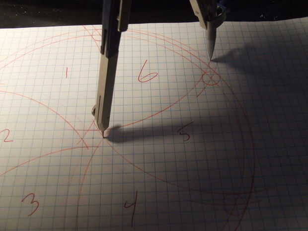 El lápiz de la brújula reunirá el exterior 8 pulgadas diámetro círculo un segmento hacia la izquierda desde el punto del hexágono donde está la aguja.
