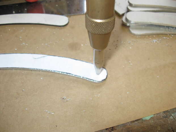 Mediante el radio 7 Seleccione un punto en el arco medio y dibujar un arco cruzado. Ahora tienes los puntos medio de uno de los 6 segmentos. Dibujar un pequeño círculo en cada uno de estos puntos finales. Estos son los puntos de taladro. Haga una plantilla de esto.