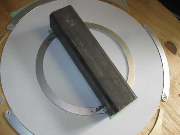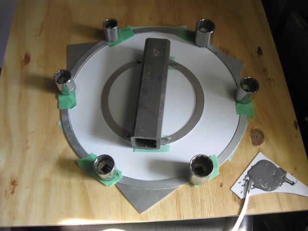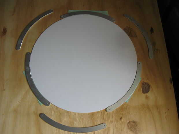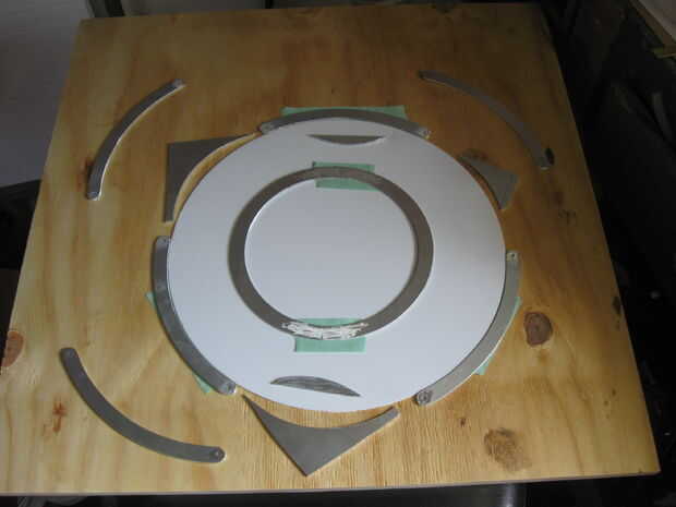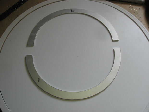 El anillo de control fue en 6 piezas, con una plantilla de corte anterior, que pude a una plantilla de encolado por espacio incluso 3 de las secciones que la superposición de los 3 restantes en los puntos de taladro.