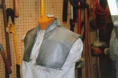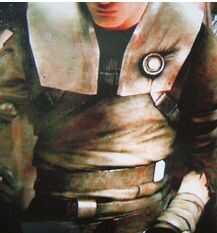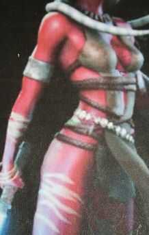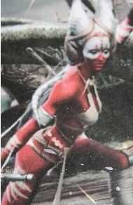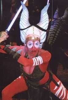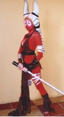 Ella lleva un traje de cuerpo teñido y pintado de la mano. El cabestro y lomo de vestir son una tela de gamuza. Utilizamos polvo de crepe de Ben nye para el hacer para arriba.