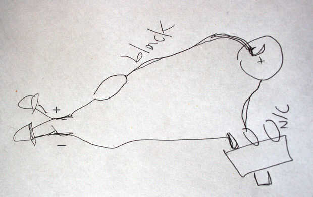 • El LED de prueba: el cable de LED más, llamado ánodo, debe estar tocando el terminal positivo (+) de la batería y el cable de LED más corto, llamado cátodo, debe estar tocando el terminal negativo (-) de la batería.