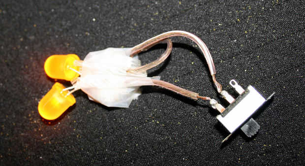• Corte dos pequeños tramos de alambre. Soldadura (o simplemente giro super bien) un extremo a una clavija interruptor externo y el otro extremo del cable mismo para el LED más corto conducen (cátodos,-)