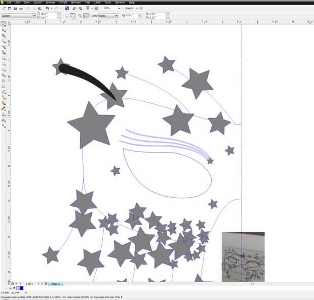 Usando mi bosquejo original como guía, dibuje muchas muchas formas estrellas por todo el rostro, arrastrándolos alrededor, girando ligeramente y cambiar el tamaño como por favor.