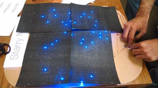 Este proyecto fue inspirado por Leah Buechley y Sketchbook computacional en el MIT de Jie Qi. 'Noche estrellada' tiene un gran circuito enorme que tiene todas las estrellas [LEDs azules] conectadas en paralelo en este circuito. Una vez que la luna 's [actos como un interruptor], todas las estrellas brillan así activando el circuito grande. Pulsando sobre los nombres de constelaciones diferentes, ves luces verdes entre estrellas que le ayudan a identifican la forma de la constelación. Cada una de las cuatro constelaciones tiene un circuito separado con LED verde para mostrar los bordes de las constelaciones.
