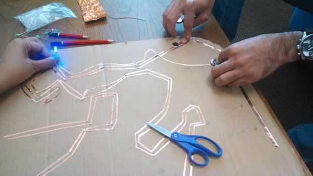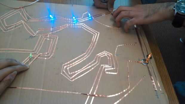 Para hacer este circuito, usted tendrá que realizar varios cortes como saltos positivos y negativos sobre la otra por no quitar el lado adhesivo de la cinta de cobre, doblar la cinta de cobre de varias maneras diferentes para mantener su conductividad, soldadura en las esquinas, en caso de que teníamos que pegar dos piezas de cinta de cobre.