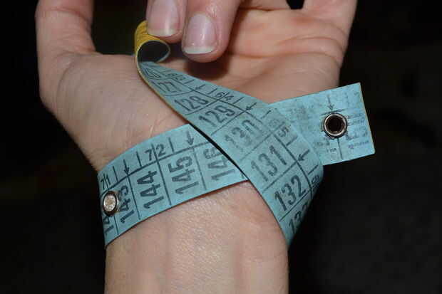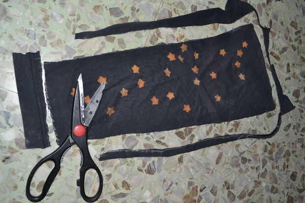 medir la circunferencia de su muñeca, uno de sus daños después de tu codo y la longitud entre ellos. hacer un trapecio con las medidas de la pieza de tela con la tiza y cortarlo.