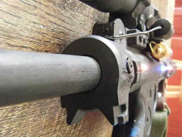 La culata está hecha de madera. He encontrado una sección de espiga de 3/4 de pulgada izquierda encima de otro proyecto para el caldo y un trozo de 2 x 4 es la cantonera forma usando una skilsaw. Aburrido un agujero en la placa de tope del 2 x 4 con un taladro para el pasador que se inserta y sujeta con pegamento caliente. La espiga luego entra en la placa trasera de la pistola. Tenía un agujero aquí también usando un molinillo de metal de forma de cono usado en metalistería hecho sólo para ejercicios. Se puede encontrar en hardware de lowes. La espiga es entonces caliente pegado en su lugar y también aprovechado un tornillo a través de la pistola la espiga dentro de...
