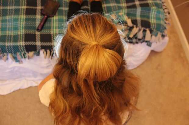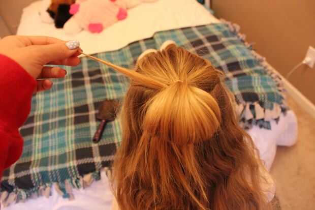 Tomar un pequeño trozo de pelo del pelo que queda fuera del bollo de pan. Envuelva todo el camino alrededor de la banda elástica claro y pin con una horquilla.