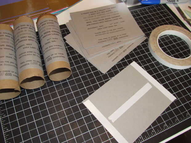 Lugar la invitación gris papel 1/2" por encima de la parte inferior del rollo de papel toalla. Se adhieren con un corredor de cinta permanente o una fuerte cinta de doble cara a lo largo de la parte posterior de la invitación antes de aplicar para el rollo de toalla de papel (cortado por la mitad). Tuve problemas con esto por lo que empecé a usar Helmar 450 secado rápido, que funcionó muy bien!