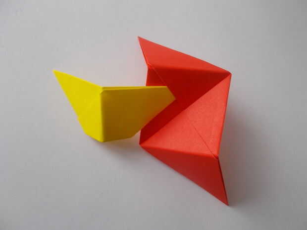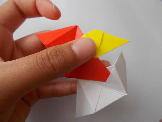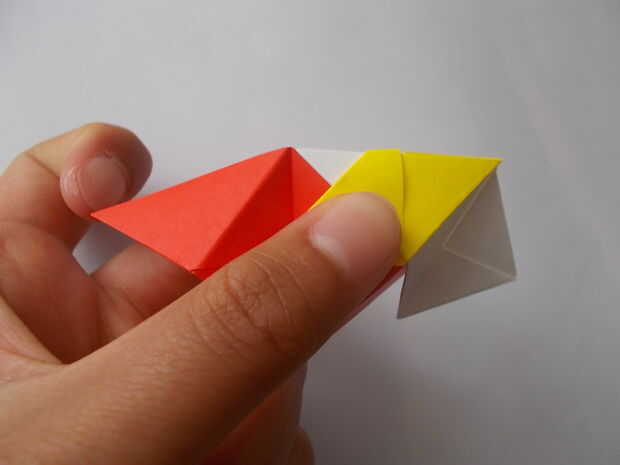 Inserte la tapa de una unidad de amarillo en el bolsillo de una unidad de red. Luego inserte la aleta de la unidad roja en el bolsillo de un blanco de la unidad. Arreglar aleta blanca de la unidad debajo de la unidad de amarillo para que ver la esquina de la aleta blanco sobresale. Cortar la aleta para que nada sobresale por debajo de la unidad de amarillo y repetirlo con las otras unidades blanco.