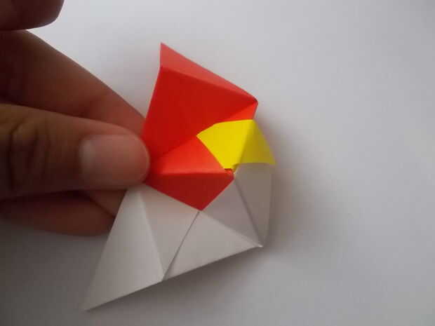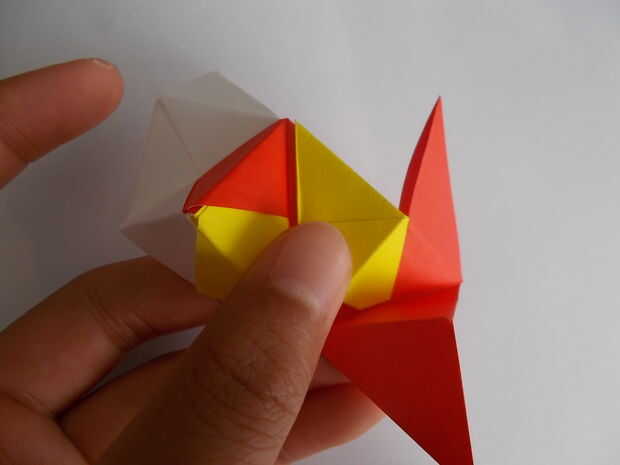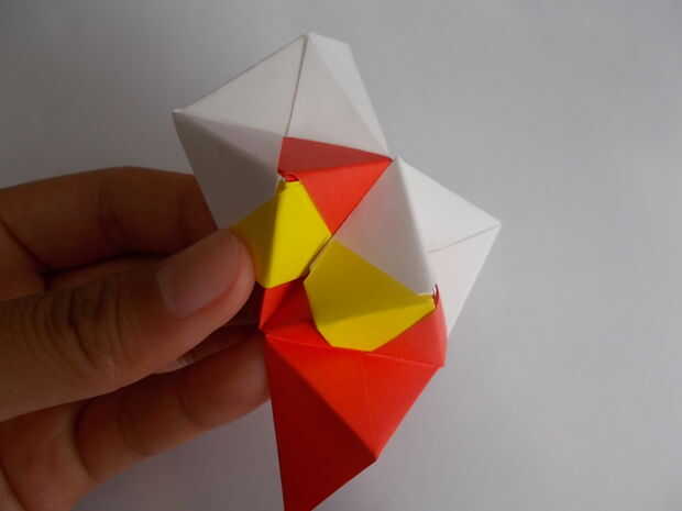 Luego coloque uno amarillo y uno rojo unidad junta como en la primera parte y luego aplicar pegamento a la parte posterior entera de la unidad de amarillo. Coloque esta parte en mitad de la unidad roja del grupo B. Grab un aparato blanco e inserte la aleta de la unidad rojo en el bolsillo de la unidad blanco y tapa de la unidad blanco en bolsillo amarillo de la unidad.