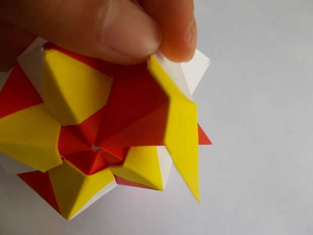 Para conectar ambos lados de la capa 2, tomar la primera aleta amarilla del bolsillo de su correspondiente red de la unidad. Aplicar el pegamento en la parte trasera de la unidad de amarillo y coloque encima de la mitad de la última unidad roja. Luego tomar la aleta e introducirlo en el bolsillo de la unidad red correcta (el uno que el aleta amarillo fue una vez).
