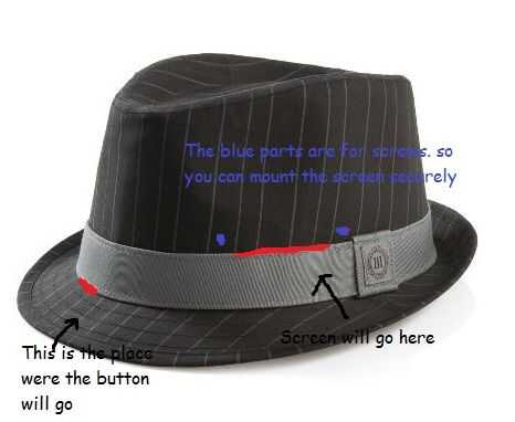 Los agujeros rojos o rodajas son los lugares donde usted puede pegar los contactos (de la pantalla) a través de la fedora y los hoyos azules técnicamente no son necesarios si se pega la pantalla para el fedora, pero si no quieres montar permanentemente a él puede utilizar estos agujeros para tornillos o algo como eso.
