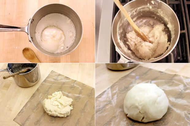 Cuando la masa se desprenda de los lados y agrupaciones en el centro, como se muestra a continuación, retire la cacerola del fuego y deje que la masa se enfríe lo suficiente como para manejar.
