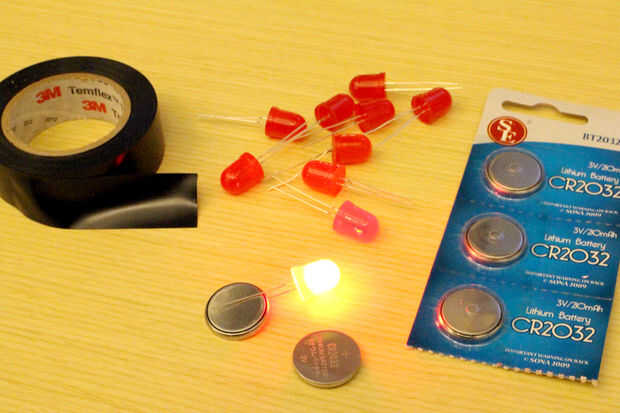 Se reúnen sus LEDs, pilas de monedas y cintas. Para hacer los ojos todo lo que necesitas hacer es los cables del LED sobre la pila de monedas para completar el circuito.