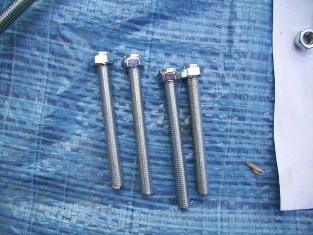 Ahora viene la broca más difíciles. Que necesitaba cortar longitudes de la varilla de 8mm roscado usando una sierra para metales y la contratuerca dentro del taladro de los agujeros en la madera. Lo bueno de las tuercas de bloqueo es que no es probable que afloje cuando atornillada en su lugar. La dificultad con ellos es que también es muy duro enroscar en el primer lugar. Usé dos llaves, una para sujetar el poste todavía y otro para girar la tuerca. Usted debe poner lavadoras en el polo, en los bordes de la madera. De esta manera cualquier presión que las tuercas se aplican a la madera se extiende, por lo que no va a dañar la madera tanto. Esto me llevó un buen par de horas para hacer, pero es que vale la pena como las tuercas solo saldría si no usé las tuercas de fijación.
