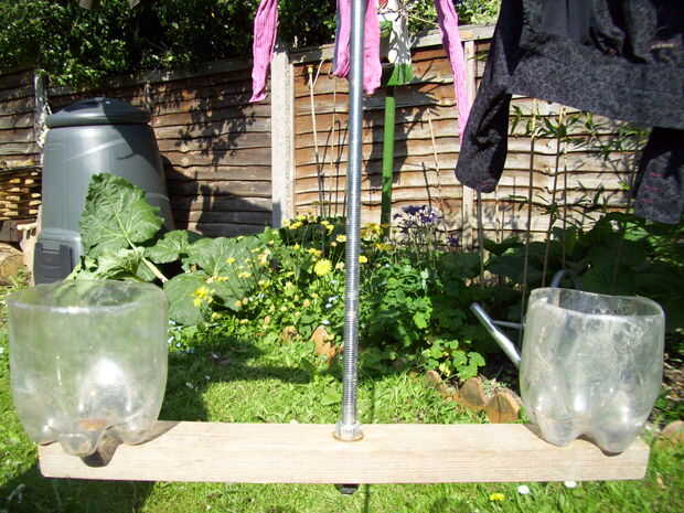 Por último, una longitud de madera debe fijarse, con igual peso de cada lado. Decidí cortar dos botellas de 2Ltr y utilizarlas como envases para el peso, utilizando piedras o arena. Esto significa que puedo ajustar el peso si es necesario, y también que no será tan pesado de llevar cuando no la estoy usando. He intentado originalmente usando una bola de plástico hueco (diseñado para flotante para uso en plomería) lleno de agua como el peso y el peso deben ser repartidos como balancear hacia fuera y evitar hacer un movimiento pendular.