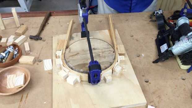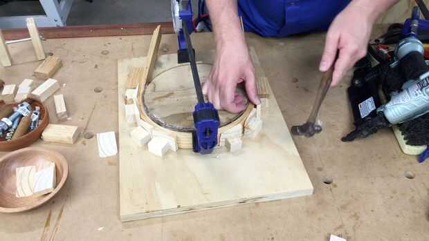 Entonces tomo las tiras mojadas y curva alrededor de la forma (círculo) que me diera la forma que quiero, utilicé una pistola de Clavos brad para colocar pequeños pedazos de madera alrededor de la la laminación doblada dejando una separación de unos 4mm, luego martilló las cuñas en las lagunas.