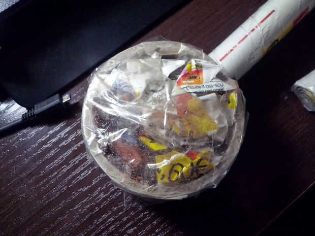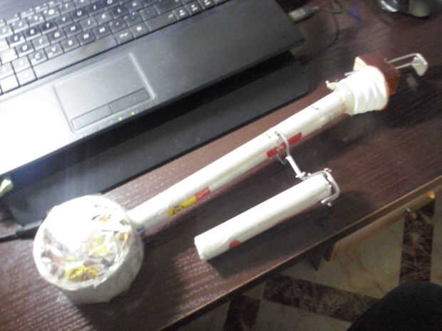 así encinté el rollo vacío con cinta hasta tres cuartas partes y empecé a meter piedras hasta el peso consideré harmonización. Luego, lo acabé de rellenar de papel para las piedras no se movieran por el interior y desequilibraran la grabación y, puesto que solo iba a usar mi móvil, lo encinté por completo una vez comprobé estaba equilibrado.