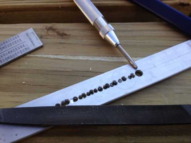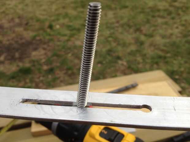 Para el montaje del cardán querrá extender el agujero en el extremo redondeado a 2" de largo. Para ello, miden de 2 3/8" desde el extremo redondeado y otro 1/4 agujero centrado en la barra de taladro. Escriba una línea por el centro de los orificios y perfore tanto material como sea posible con un 3/16" bits de la misma manera que en la foto de la ranura del bastidor principal. Archivo siguiente, hacia fuera el aluminio restante durante la prueba con el perno de carruaje hasta que el perno se desliza suavemente hacia adelante y hacia atrás sobre su hombro cuadrado. Terminar por la cuadratura de los dos extremos de la ranura.