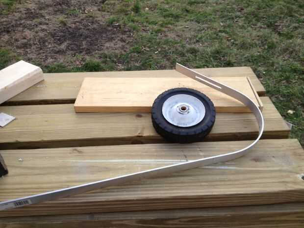 El marco principal de la curva, coloque la barra en la rueda de 6" y comenzar la curva alrededor de una pulgada de la ranura. Tire de la parte inferior del marco alrededor de la rueda hace 45 grados para permitir la parte posterior de resorte.
