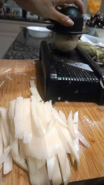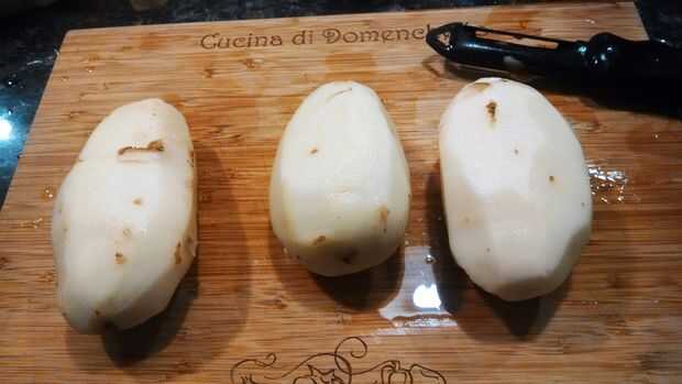 Empieza calentando el aceite de cacahuete en una sartén profunda hasta 320 f el. Luego enjuagar y pelar patatas.