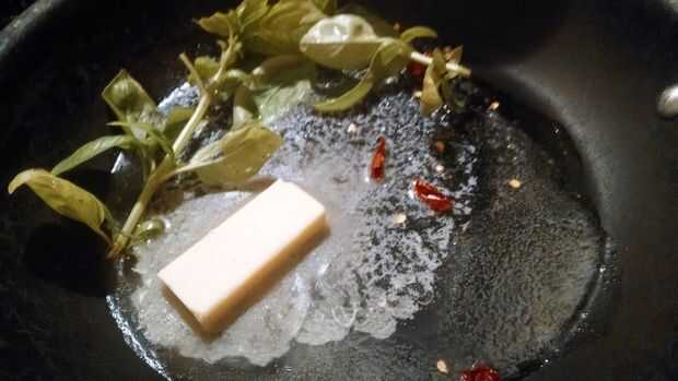 Calentar una sartén a fuego medio y derretir la manteca con pimientos rojos secos picados y un tallo de albahaca para la fragancia. Coloque a fuego medio alto y set de ternera en pan.