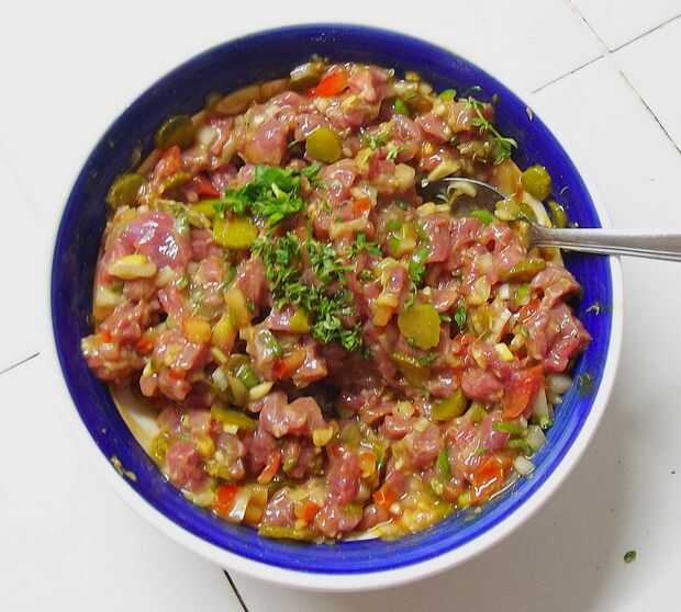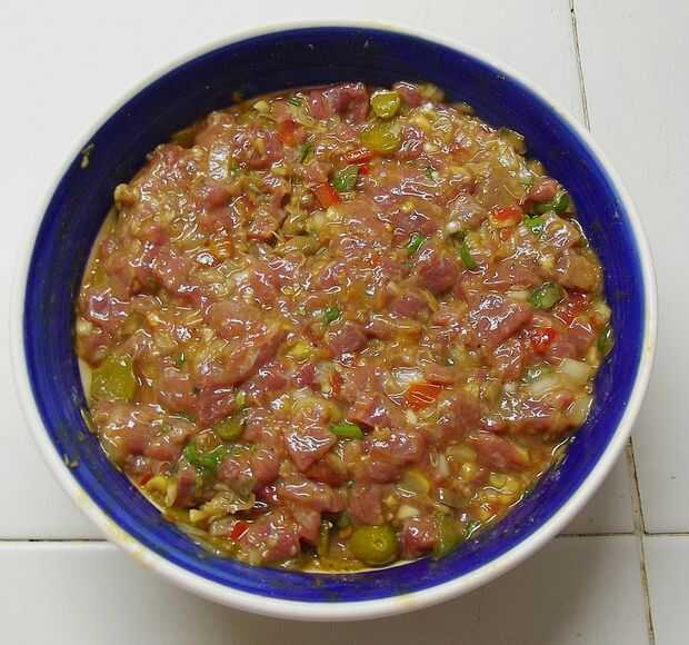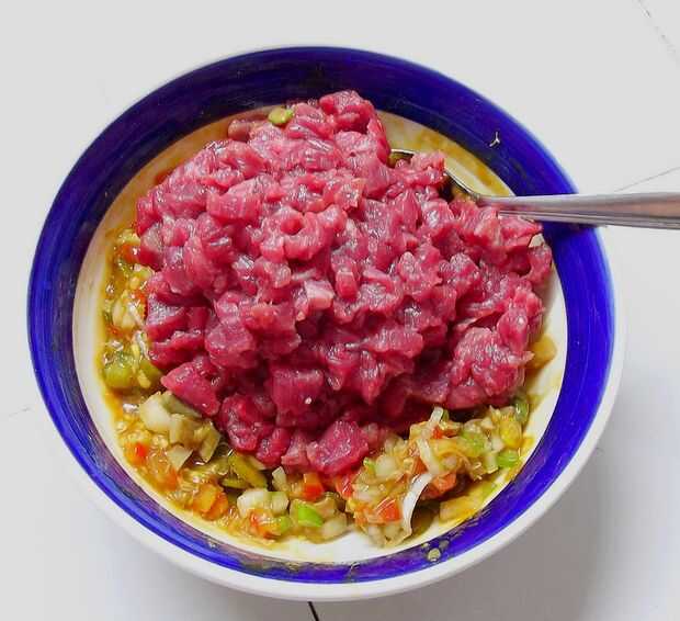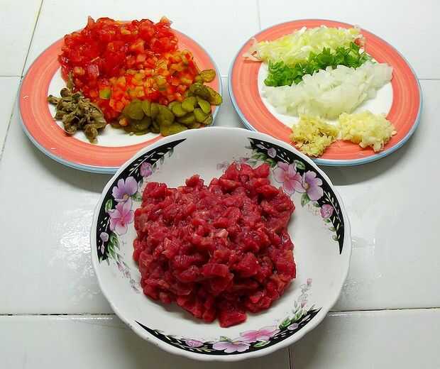 Para comenzar, debe quitar toda la grasa de la carne y cortar en trozos muy pequeños. Se recomienda no utilizar una amoladora, siempre son difíciles de limpiar por completo, es mejor usar un cuchillo afilado. Si tienes dificultad para cortarlo, trate de ponerlo en el congelador y luego cortarlo mientras todavía está congelado. Entonces retorno al refrigerador (no congelador) mientras prepara los otros ingredientes.