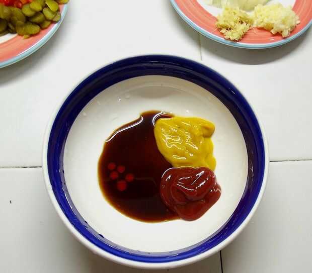 En un bol, añadir la cucharada de mostaza, salsa de tomate y salsa inglesa. Mezclar y añadir el resto de ingredientes picados. Si decides añadir Tabasco, añadir a su gusto, en mi caso con 5 gotas es suficiente.
