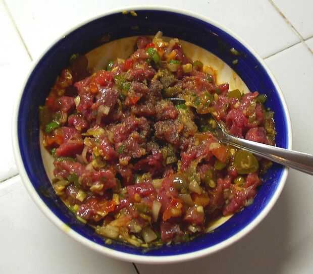 Después de mezclar los ingredientes para lo que sería el Steak Tartar de salsa, tomar la carne de la nevera y mezclar con la salsa. Removemos todo bien, también agrega pimienta, sal, albahaca y tomillo al gusto.