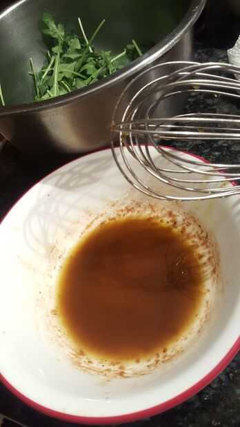 En un bol mezclar los ingredientes para la guarnición de rúcula. Primero añadir en aceite de oliva, vinagre balsámico, sal y pimienta, miel y mostaza de dijon. Batir hasta que todos se han mezclado muy bien. Probar y ajustar. Tomar la rúcula y mezclar con el aderezo agregar lentamente asegurándose de no agregar demasiado. Debe ser sólo ligeramente vestidas. Usando sus manos sacúdalo alrededor.