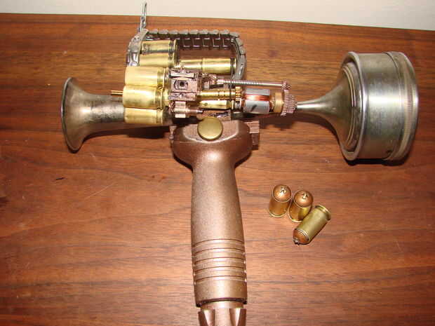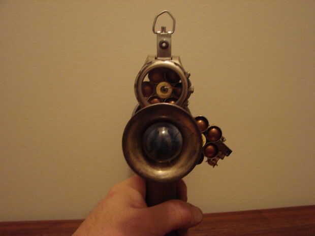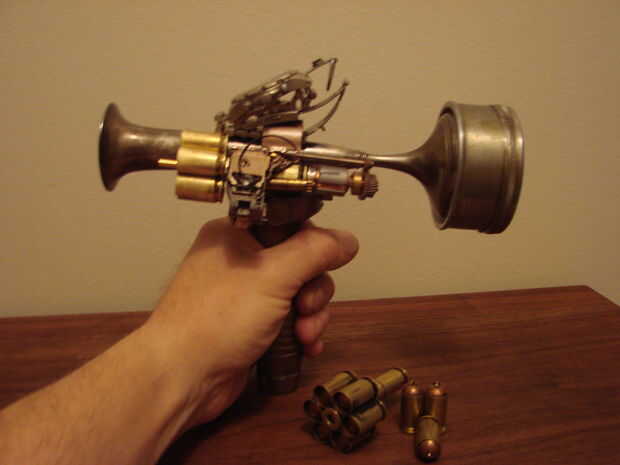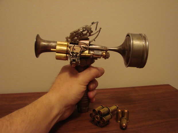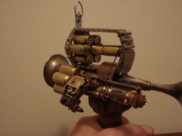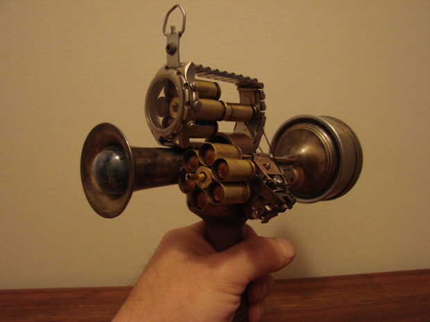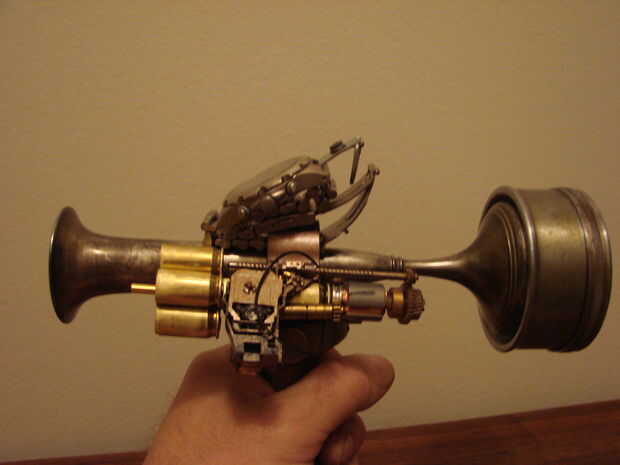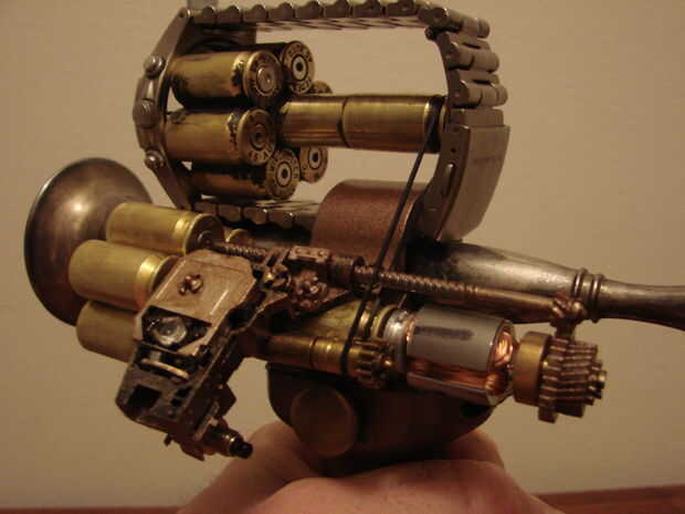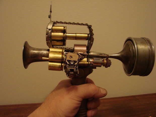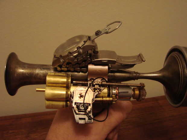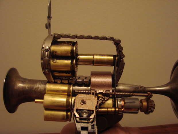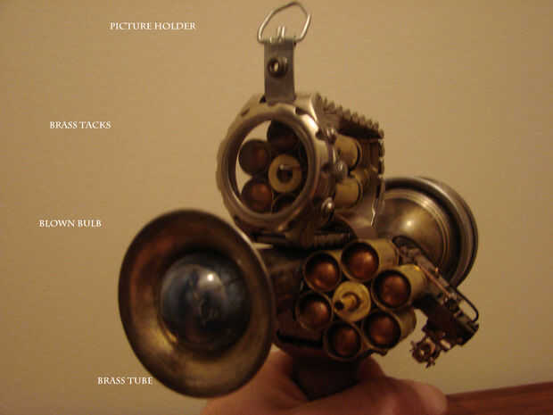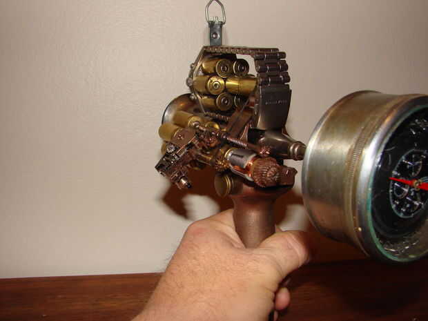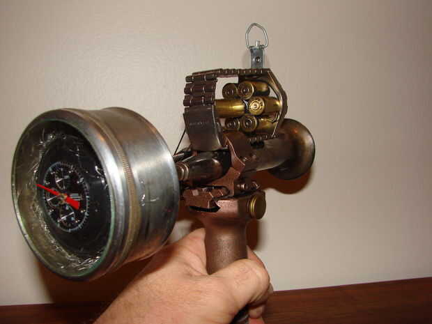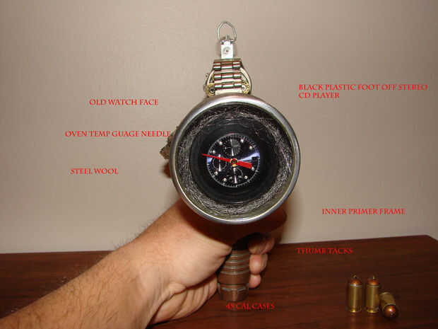 Básicamente esta hecha de un jarrón antiguo, calibrador, algunas cubiertas llamada 45, reloj antiguo y algunas piezas de mi cajón de la basura.