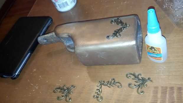 Varias piezas de marco de cuadro metálico enrollado ornamental agradable de la sección de scrapbooking de Michaels Arts fueron inmediatos pegado a la tapa del receptor para añadir un toque ornamental similar a grabado.