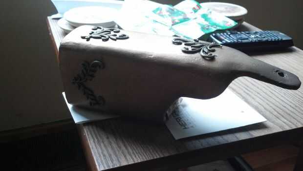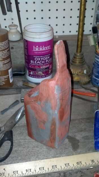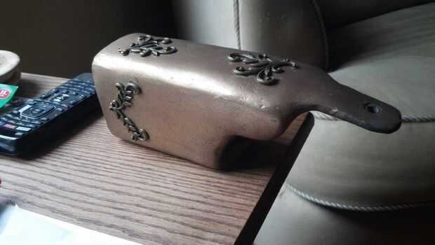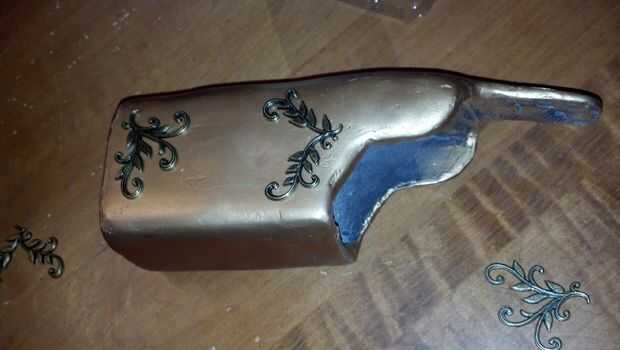 La cubierta fue rodada con la pintura plana marrón camuflaje Krylon Ultra y luego lijar. Luego aplica una aplicación bastante abundante de oro antiguo Rub N Buff para darle un acabado metálico, luego pulir con un paño de algodón suave para darle un alto brillo. Usar marrón como una capa con oro rub n buff, negro como una capa de plata.