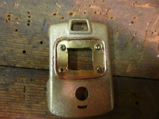 Fui a la tienda de hardware y tiene un pie de alambre revestido de cobre, que me costó sólo 9 céntimos. Había despojado este cable con un cuchillo y había doblado para formar alrededor de la placa frontal de latón. La pegué abajo con mas de mi super pegamento, que llevó a cabo muy bien. También he notado que el alambre de cobre había cubierto de áspero, cortar los bordes del latón, dándole mucho más acabado y pulido aspecto.