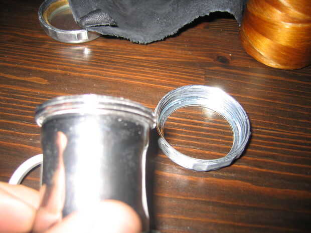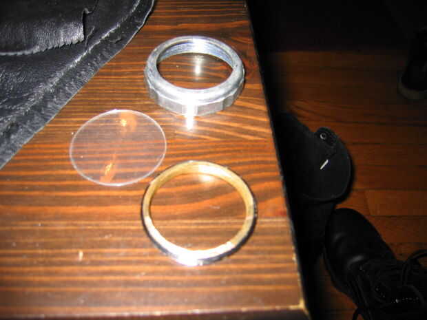 Cortar dos círculos en una hoja de plástico transparente del mismo diámetro del interior del anillo exterior. Jodido los hilos hacia atrás para mantener las lentes en su lugar.