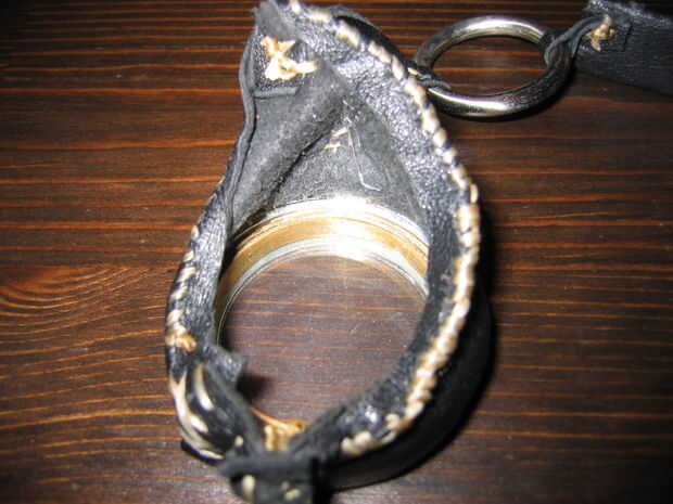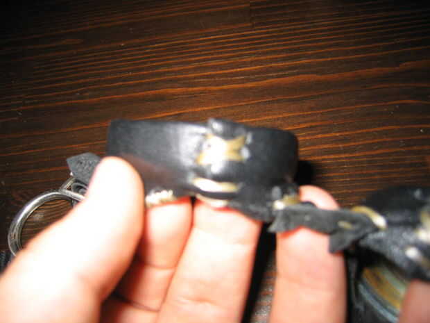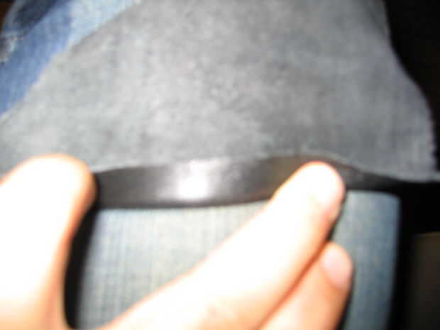 A continuación corté lo que ahora era un tubo de cuero en un ángulo hacia abajo hacia la superposición. Esto evita la superposición ligeramente abultada en el centro cerca de la nariz. Doblado sobre los bordes Bolero les cosió con el nervio y la aguja para poner una mejor mirada borde sobre ellos.