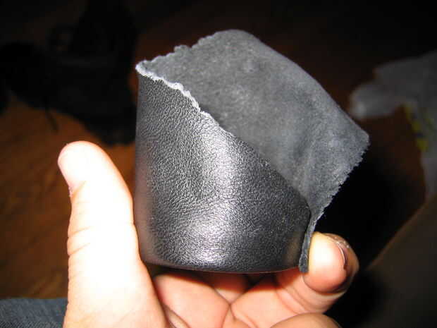Cortar una pequeña tira de cuero alrededor de una pulgada y un medio largo por una pulgada de ancho para la nariz puente. Realmente tuve que cortar esto que dos veces, porque la primera vez era grande para mi cara, quizás tenga que ajustar esto a tu propia cara.