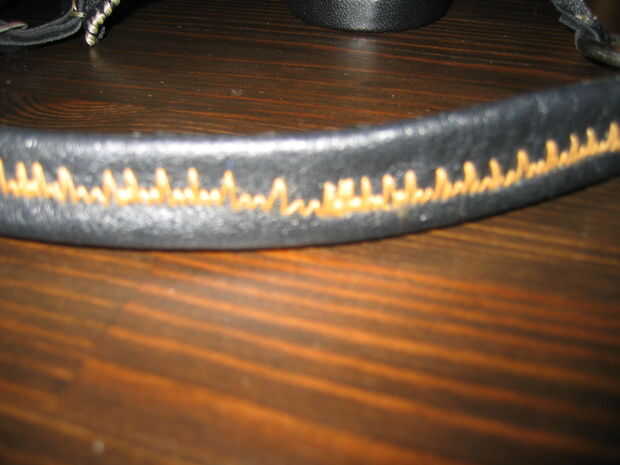 Tomó una medida áspera alrededor de la parte posterior de mi cabeza de poco más de mis oídos y corte una tira de una pulgada y media para que coincida con la longitud. Doblé la tira sobre sí mismo dos veces por lo se convirtió en mitad de una pulgada gruesa pero tres capas. Puse una tira delgada de Liquid Nails entre cada capa y fijar todos juntos. No creo que era totalmente necesario, pero a la siguiente parte más fácil. Funcionó todo a través de mi máquina de coser con un hilo de aguja y vaquera de cuero con una puntada que mi máquina ha construido en lo que parece un patrón de latidos del corazón. Obviamente, esto era sólo una elección estética.