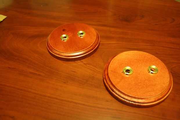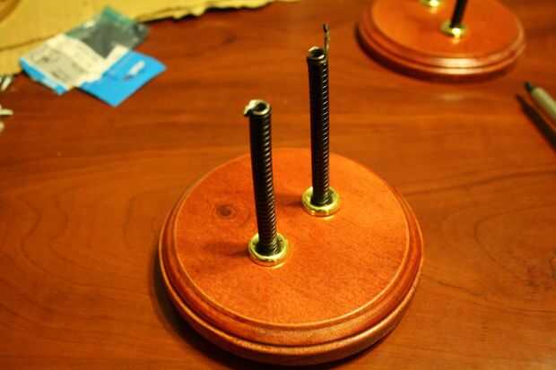 Una vez que los agujeros se perforan y se tiñe la madera y acabado, usted querrá lugar #12 latón avellanado arandelas de acabado como se muestra. Pegado, pero usted podría técnicamente sólo resbalón sobre el acero flexible bobina piernas y dejar que la gravedad les mantenga en la base, aunque podrían ser flojos de esta manera.
