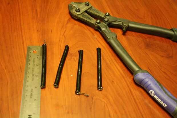 Para hacer las piernas, tomé una herramienta de recolección magnética flexible de Tekton de 24 pulgadas y cortar su brazo de bobina de acero. No sabe realmente lo que se llama correctamente, así que basta con mirar la imagen. La longitud total fue de un poco más de 16 pulgadas, así que usando los cortadores de pernos o una herramienta similar, cortado en 4 pedazos de aproximadamente 4 pulgadas cada uno, dejando un poco extra en cada extremo para trabajar con.