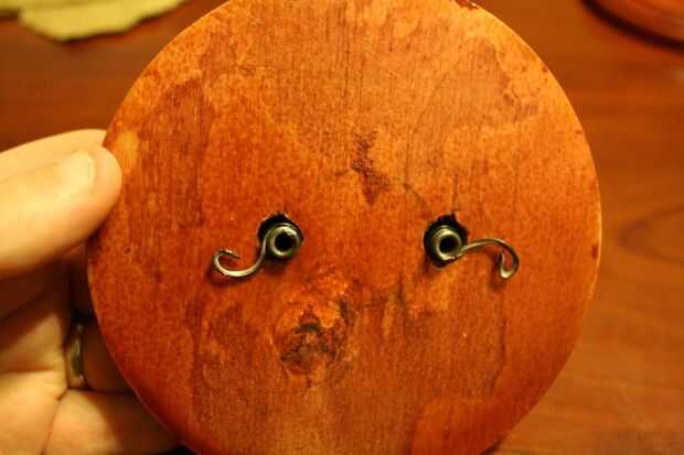 Unir las bases es probablemente la parte más fácil. Comience por dos agujeros en cada una de las 5 pulgadas de diámetro alrededor de las placas de montaje de madera para los pies montar en. El diámetro dependerá del diámetro de la bobina de acero flexible que encuentra. Los agujeros que ha perforado eran cada 1/4 de pulgada. Como la madera madera lisa, incoloro, también tuve que manchar y laca después de taladrar los agujeros. Si su base es similar, debes entonces mancha y terminar a su gusto. Usé una mancha cereza oscurezca, como encaja bien con mi decoración.