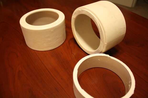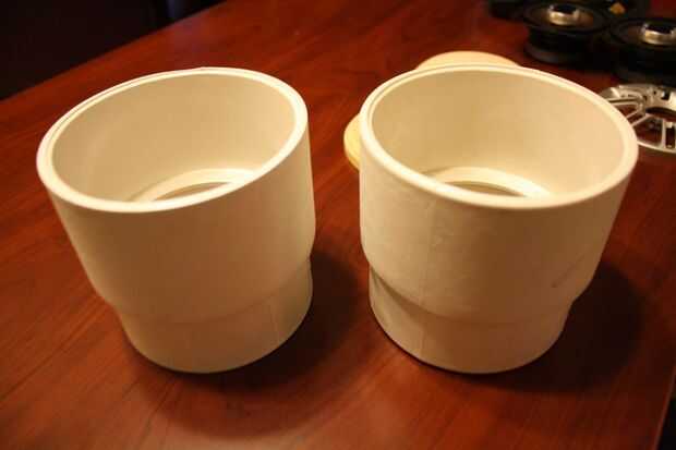Suponiendo que usted consigue los mismos adaptadores de adaptador de PVC que tengo, la parte más pequeña con una mesa de sierra o sierra para cortar ingletes (como siempre, tenga cuidado con las herramientas eléctricas y tomar todas las precauciones debidas). Usted puede encontrar que no necesita cortar el extremo más pequeño, sin embargo. Sólo lo hice porque las placas terminales de altavoz que encontré encajan mejor con el extremo pequeño quitado, e hizo facilitan el trabajo al fijar los soportes de montaje interior. Su kilometraje puede variar. Una vez que han cortado los extremos más pequeños en ambos, debe dejar con dos anillos de PVC cerca de 5,25 pulgadas de diámetro y 3 pulgadas de ancho.
