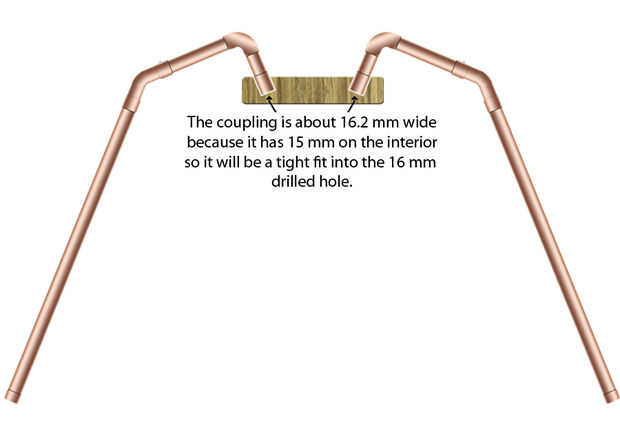 Como se muestra en la imagen principal puso las piernas creadas en sus zócalos correspondientes que se perforaron en el cilindro de madera. Porque los orificios son de 16 mm de ancho y el acoplamiento para la tubería de 15 mm son unos 16,4 mm de ancho, el ajuste será muy apretado. Puede arreglar las piernas en su lugar con pegamento especial pero debido al ajuste apretado, todo se queda juntos muy bien.