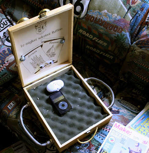 puse espuma dentro de la caja del vino, para sostener el iPod y altavoces. Cuando la tapa está abajo, la silicona abraza a los altavoces. El sonido sale de los cuernos, y el sonido que se filtra dentro da un tono cálido a los cuernos "débil".